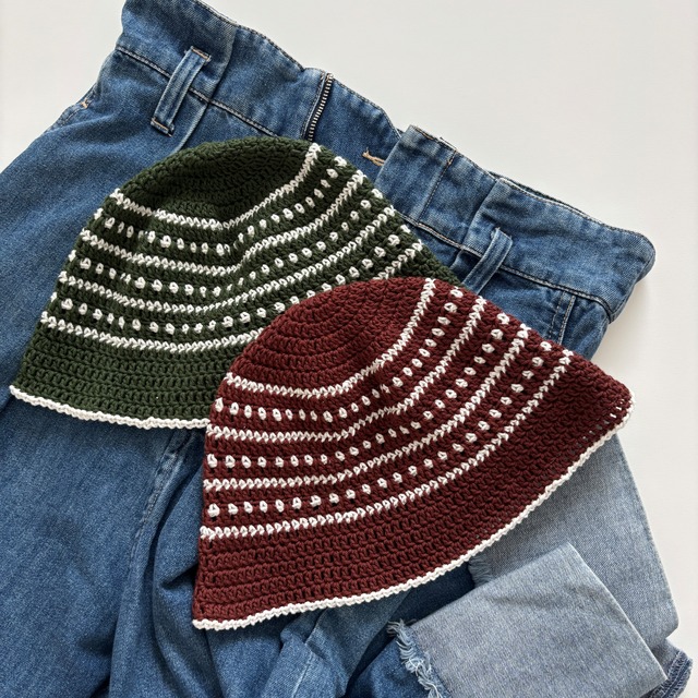 ○1点1点丁寧に編んでおります○ 鮮やかなグリーンとクリーンなホワイトのコントラストが目を引く個性派バケットハットです。 ストライプの中にドット柄を散りばめた、シンプルながらも個性的で遊び心のあるデザインに仕上げました。 ♦︎素材♦︎ アクリル ♦︎カラー♦︎ グリーン×ホワイト ♦︎サイズ♦︎ 頭部:約59cm〜 高さ:約21cm 伸縮性があり、男女問わずお使いいただけます。