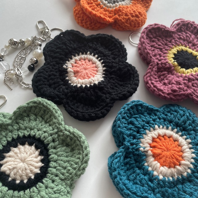 ○1点1点丁寧に編んでおります○ 存在感抜群! イヤフォンがピッタリ入るサイズ感の 大きめフラワーチャームです☺︎ ビーズチャーム部分は取り外せますので、 別々でお使いいただくことも可能です。 *①の金具で発送いたします。 ♦︎素材♦︎ 毛羽立ちの少ない コットンとアクリルの混合糸を使用 ♦︎カラー♦︎ ・ブラック×ピンク ・オレンジ×グレー ・ターコイズ×オレンジ ・バイオレット×ブラック ・グリーン×ベージュ ・ブルー×ブラウン ♦︎サイズ♦︎ 約12cm 編み物ですので強度は高くありません。 あまり重たいものは入れないことをオススメします。