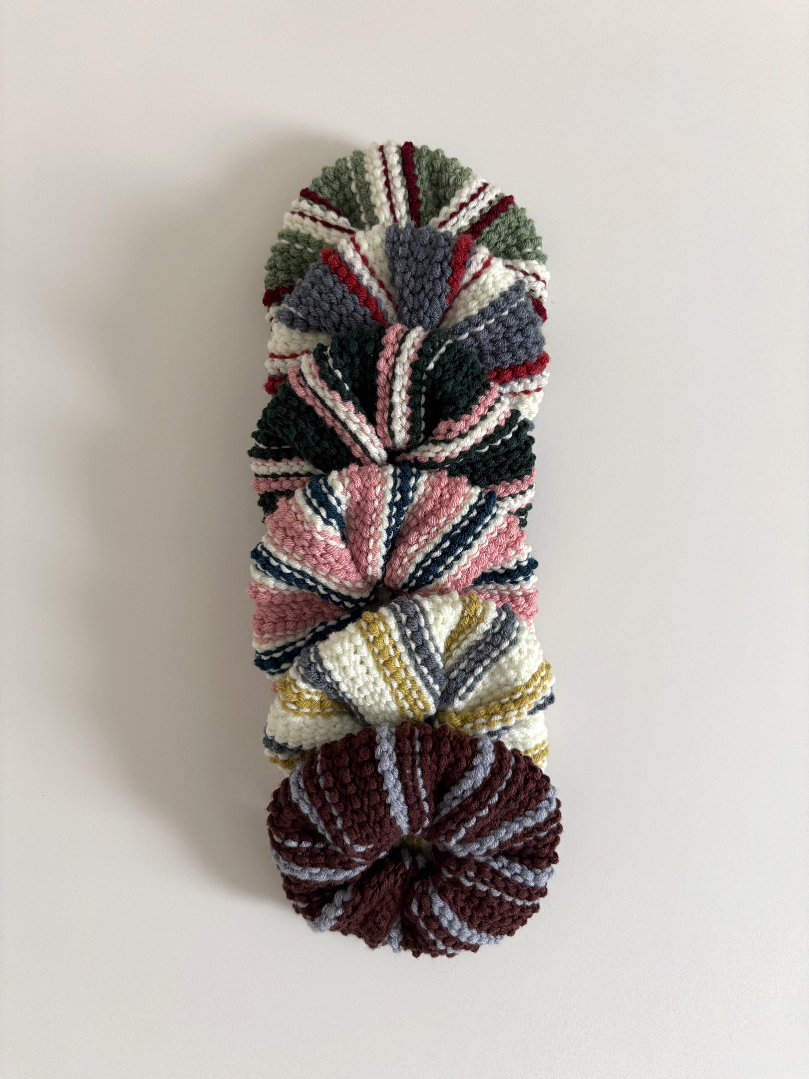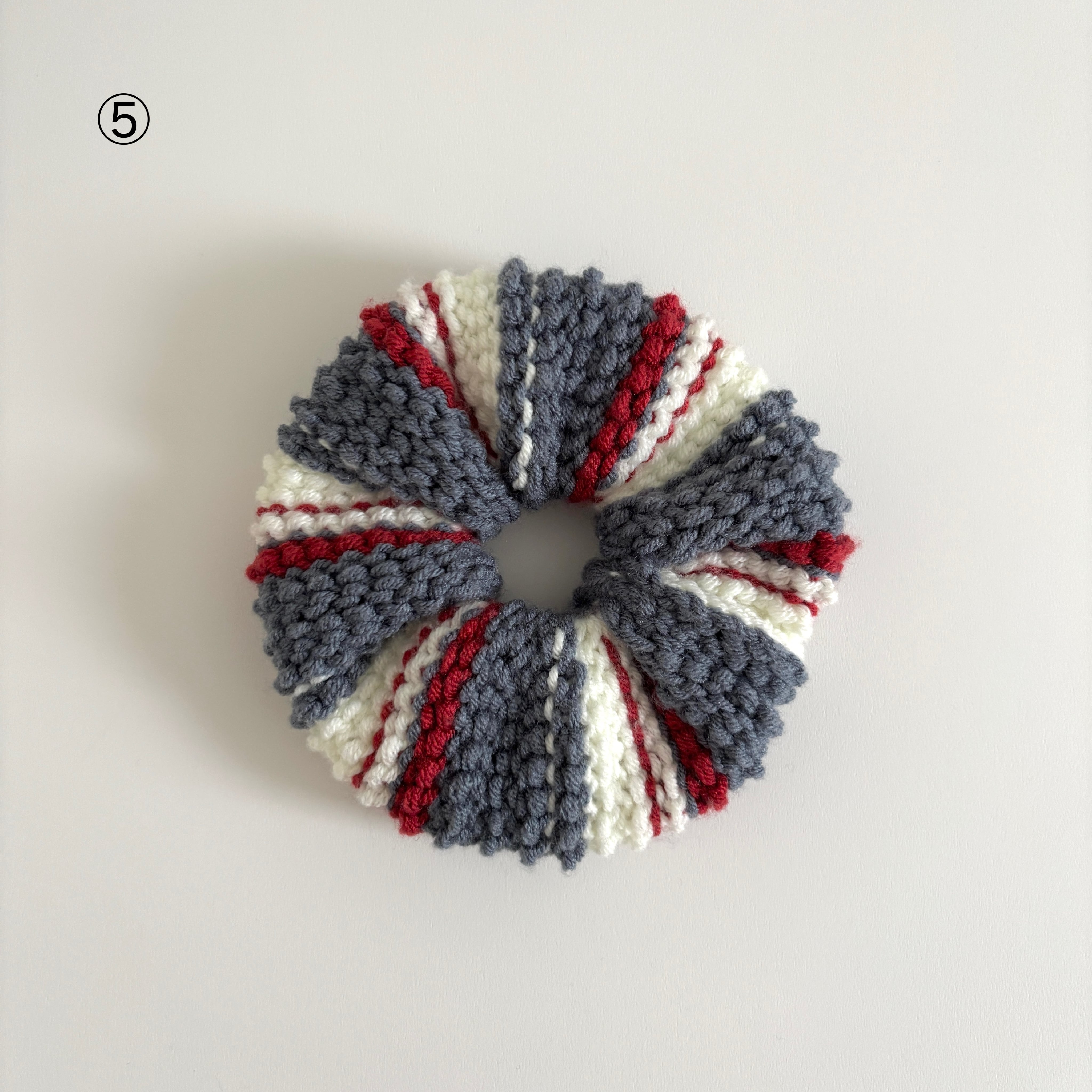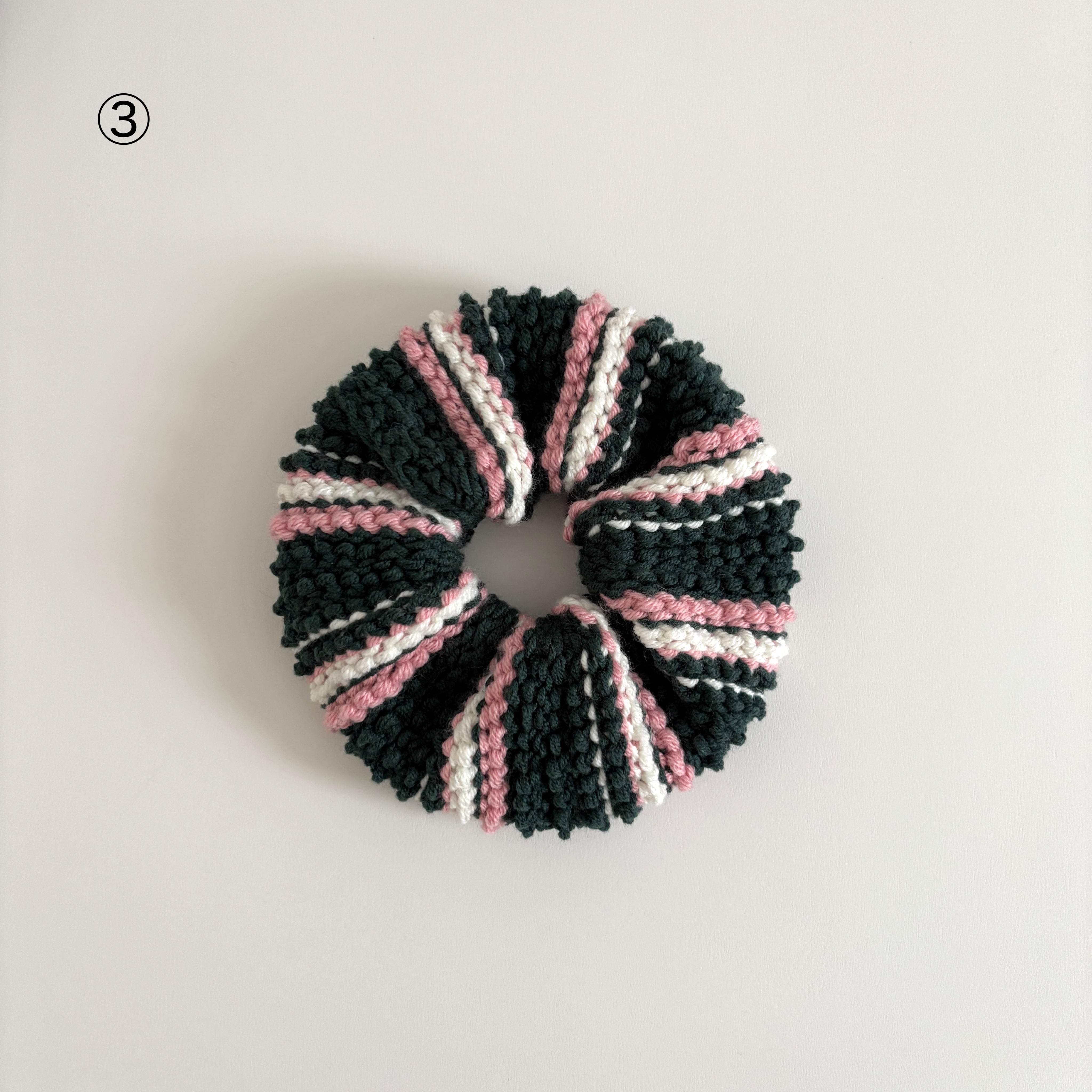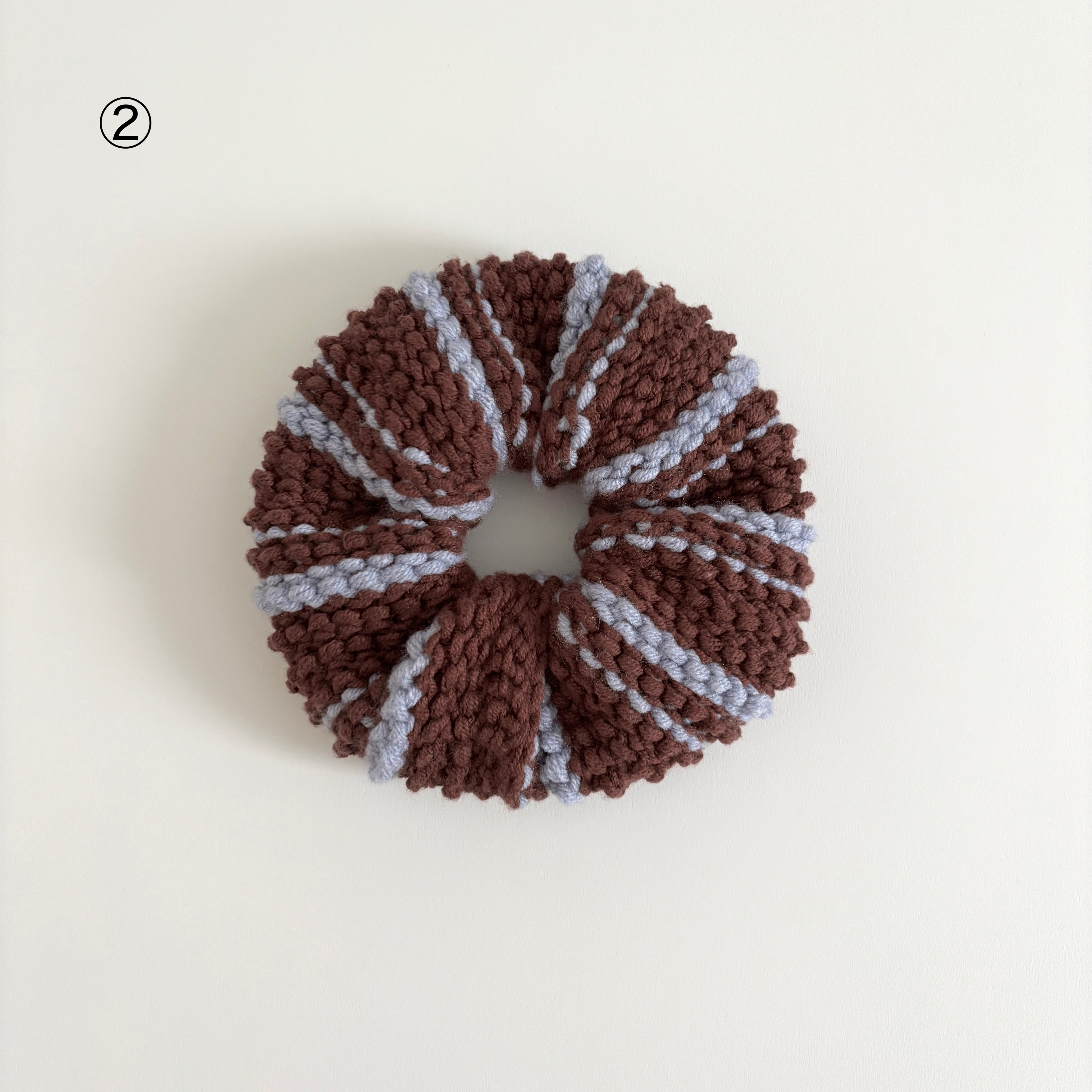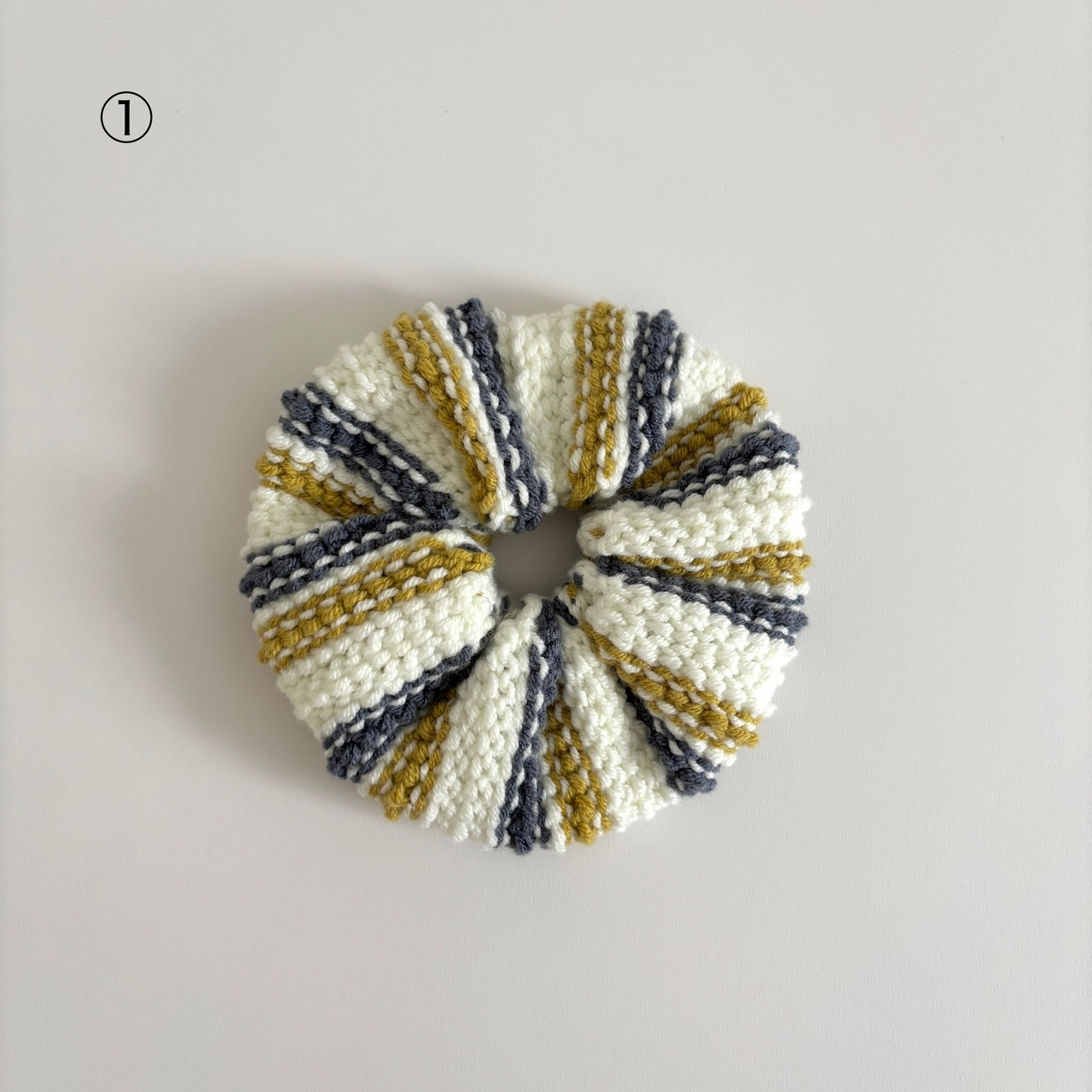 ドーナツみたいなぷっくり感がかわいい、個性派デザインの手編みシュシュ。