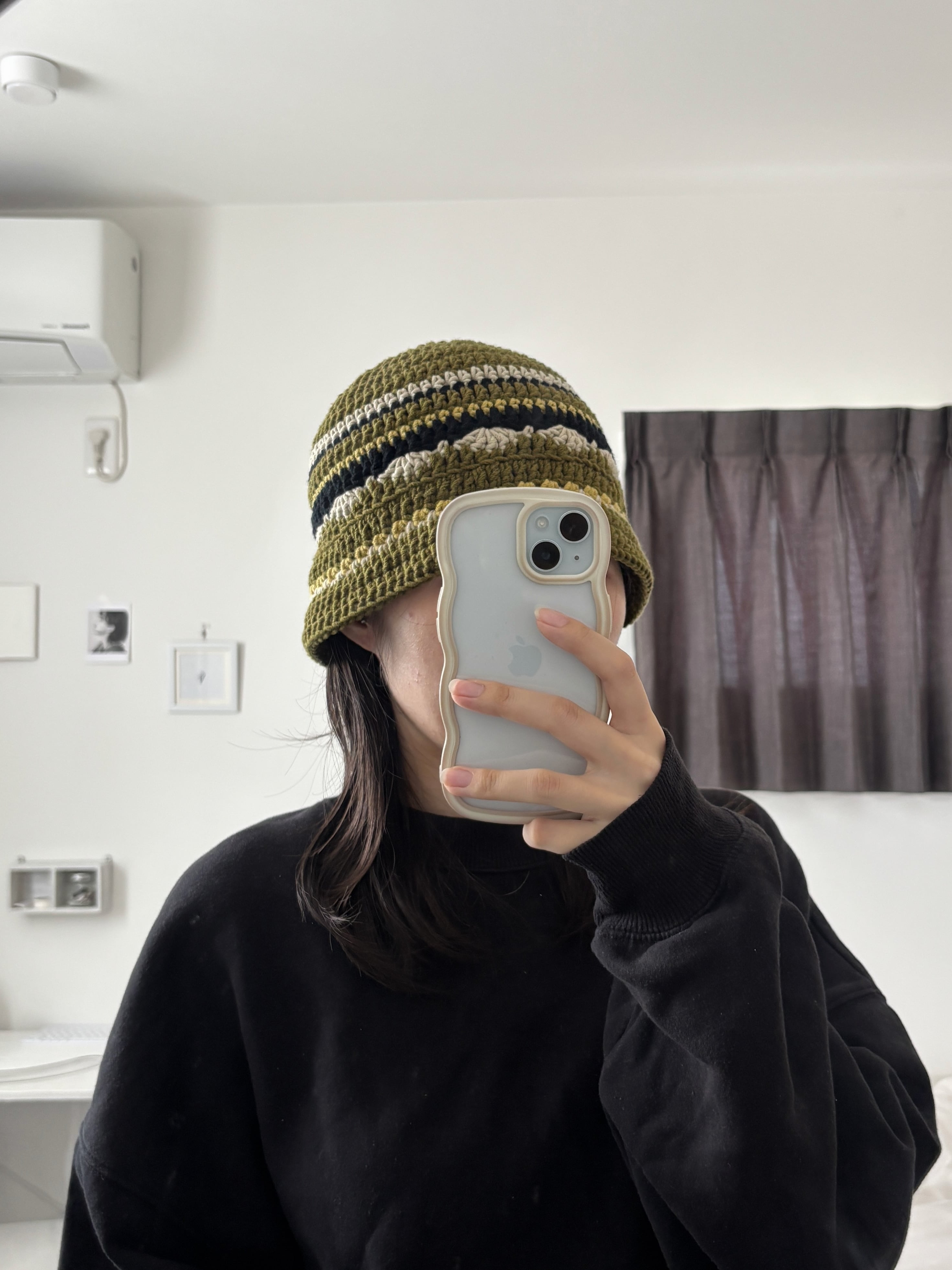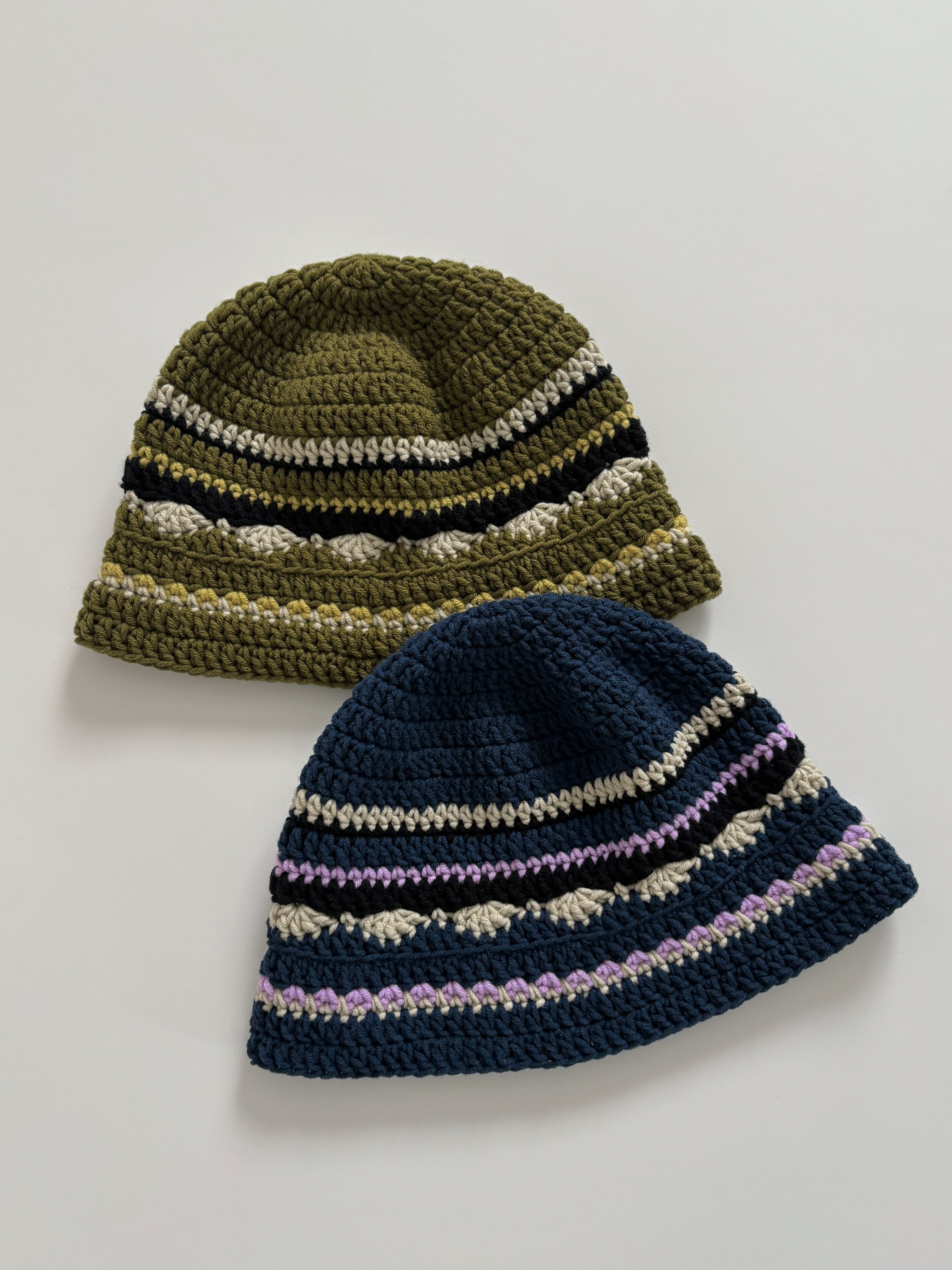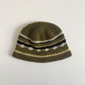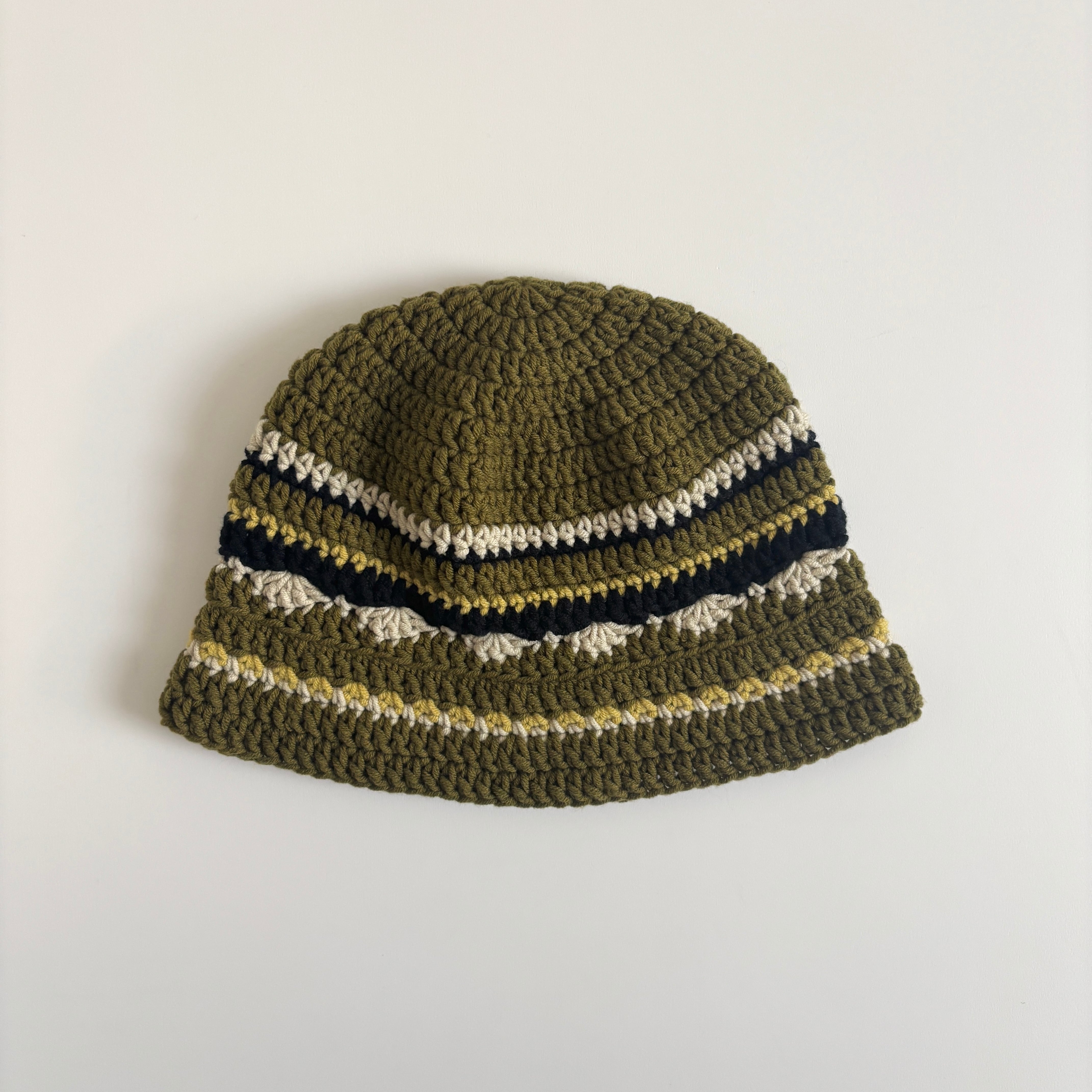 深いアーミーグリーンをベースに、ブラック、ホワイト、マスタードイエローの配色ストライプを効かせた個性派デザインのバケットハットです。