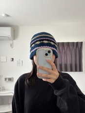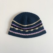 深いネイビーブルーをベースに、ブラック、ベージュ、ピンクの配色ストライプを効かせた個性派デザインのバケットハットです。