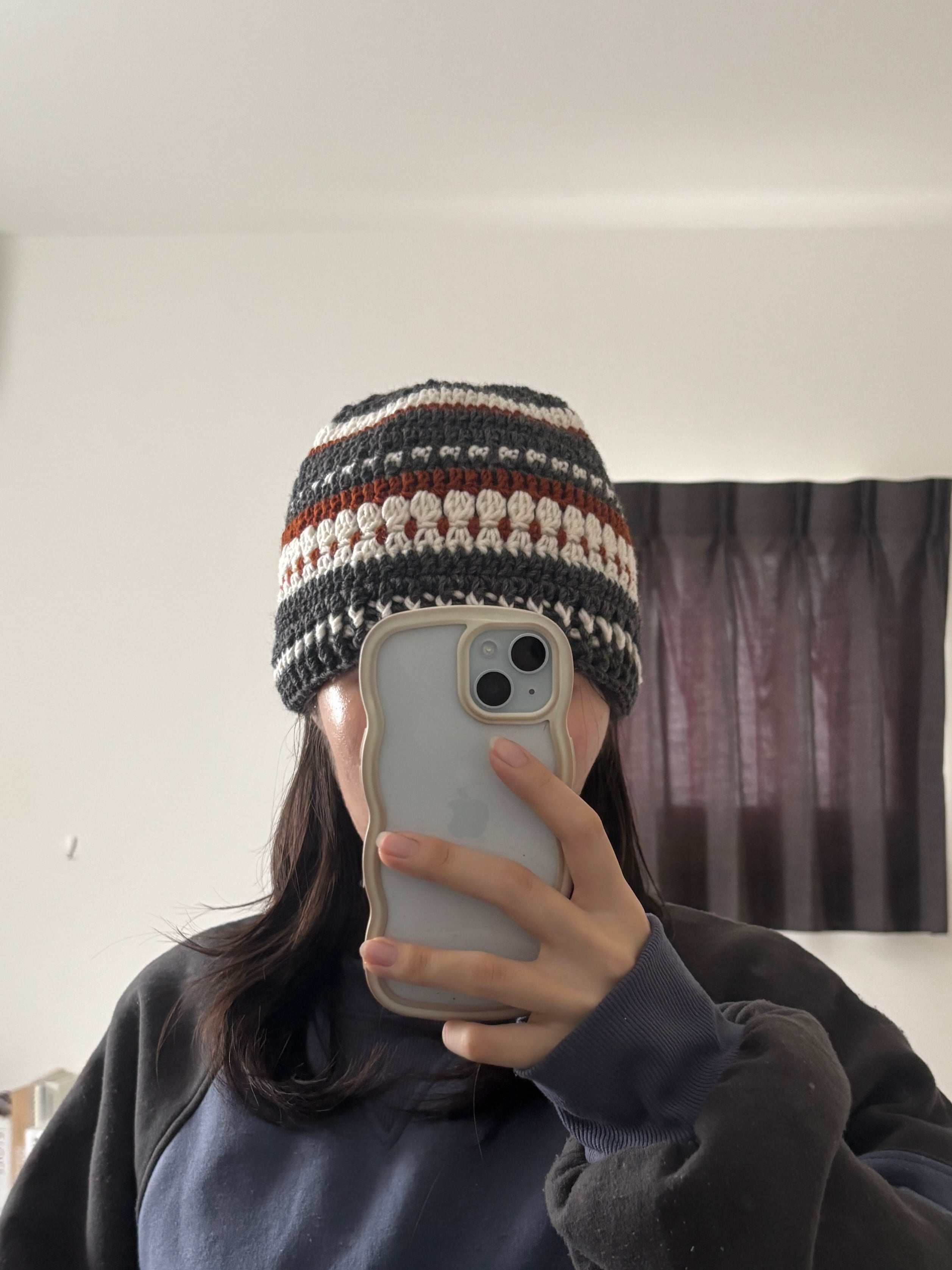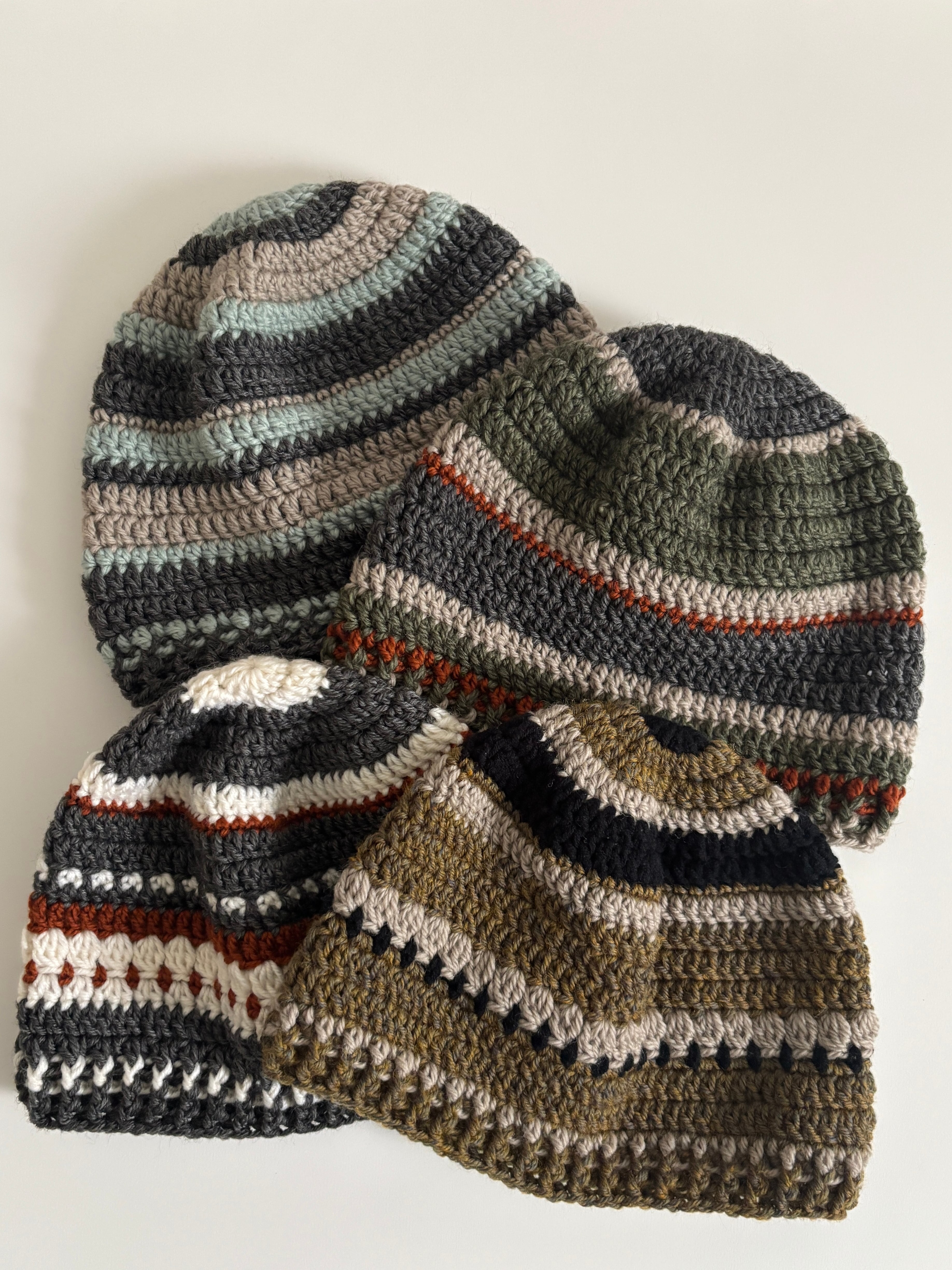 落ち着いたトーンのボーダーに立体的な編み地を組み合わせ、表情豊かに仕上げました。