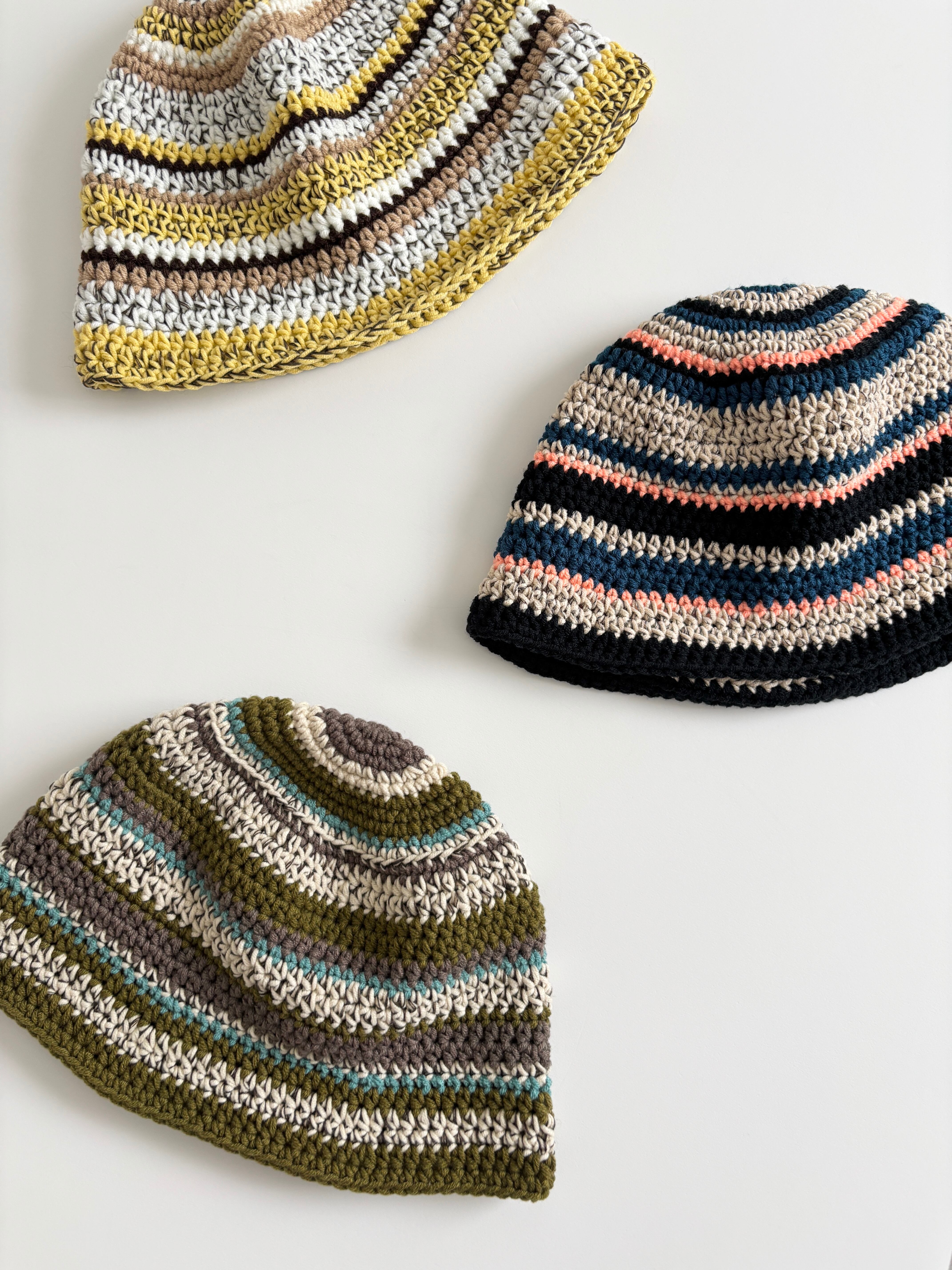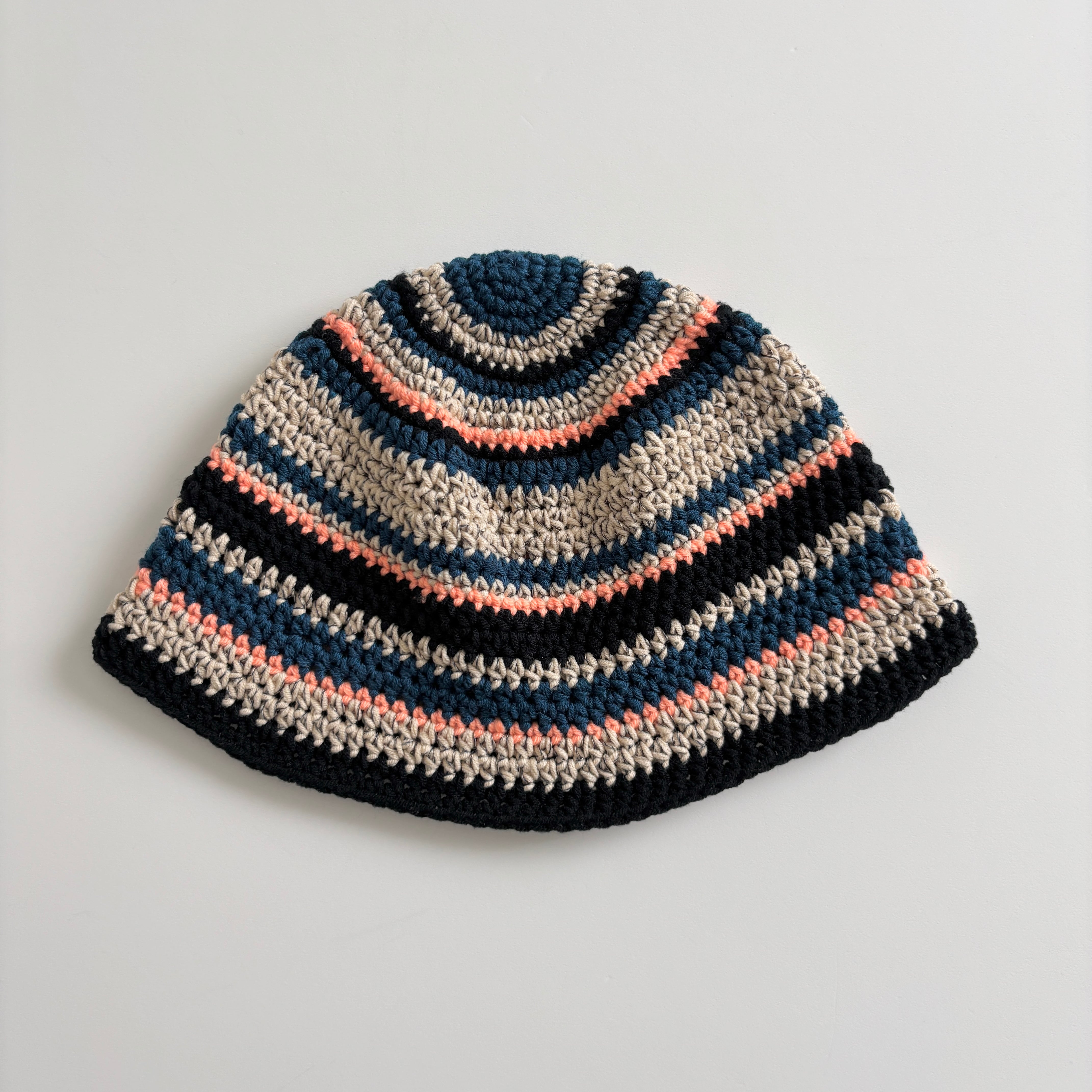 ベージュを主役に、ブルーやブラックを織り交ぜ、表情豊かなデザインに仕上げたバケットハットです。