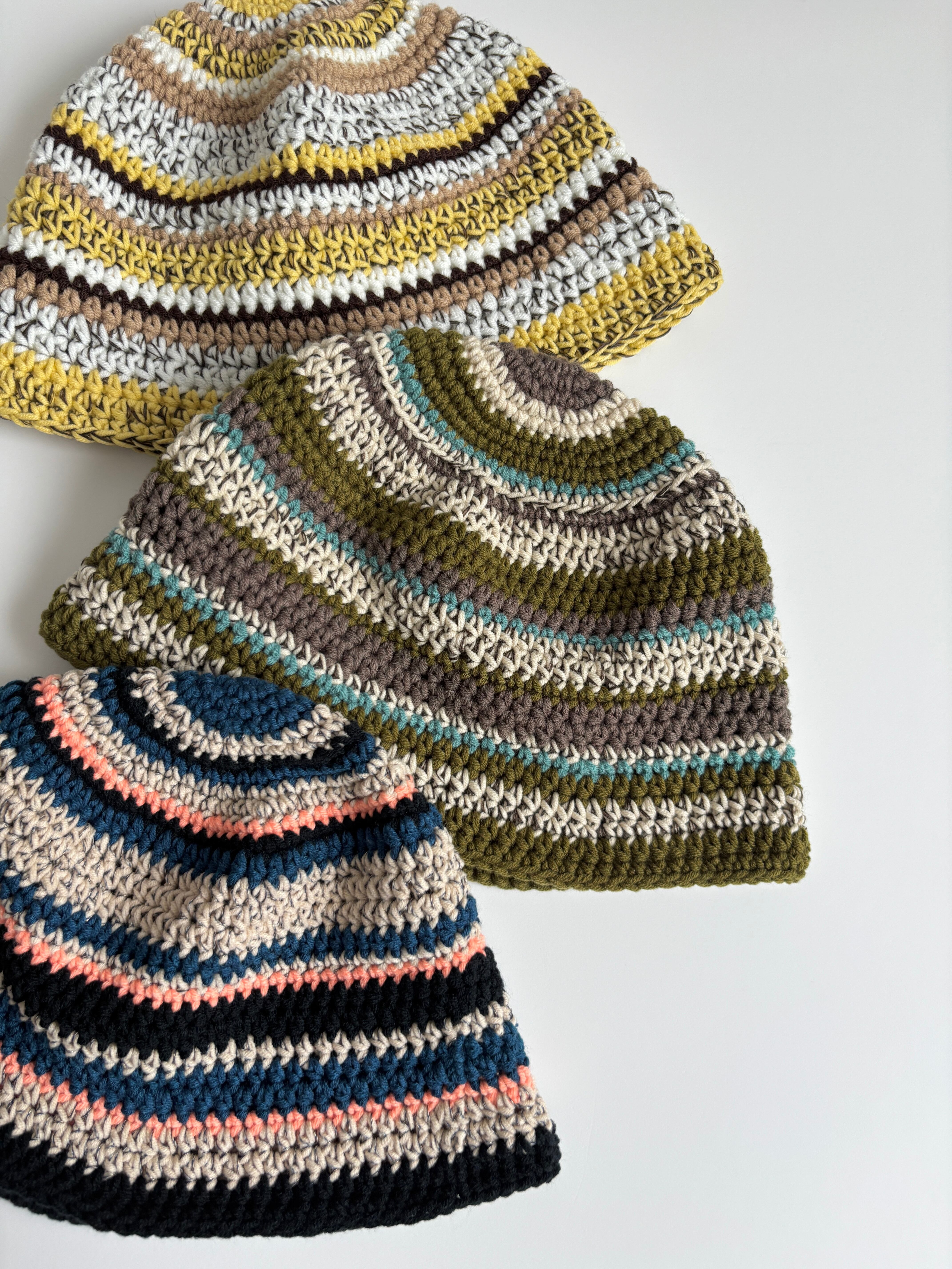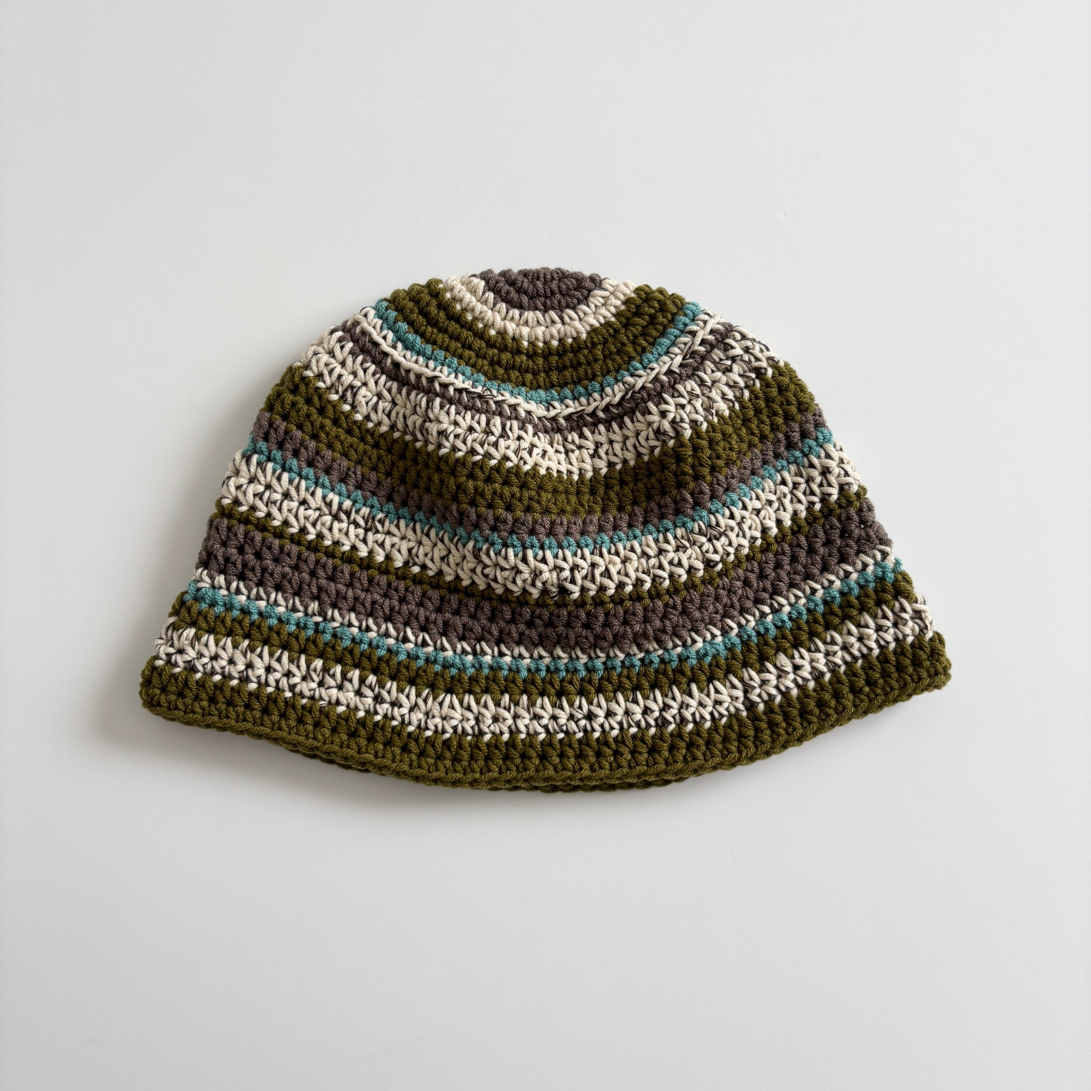 グリーンを主役に、ベージュやブラウンを織り交ぜ、表情豊かなデザインに仕上げたバケットハットです。
